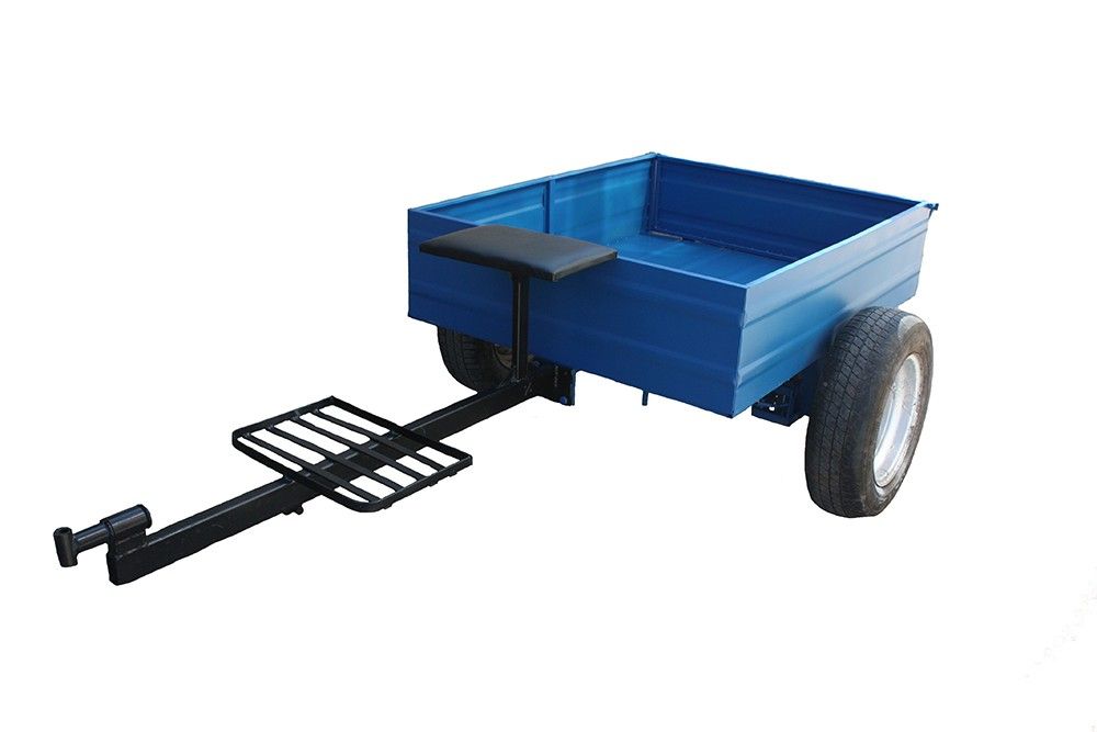 Прицеп к мотоблоку 1215х1650 мм без колес, не самосвальный, оборудован дисковыми тормозами, откидной ножкой, под жигулевскую ступицу без колес, задний борт открывается. Грузоподъемность 300 кг.